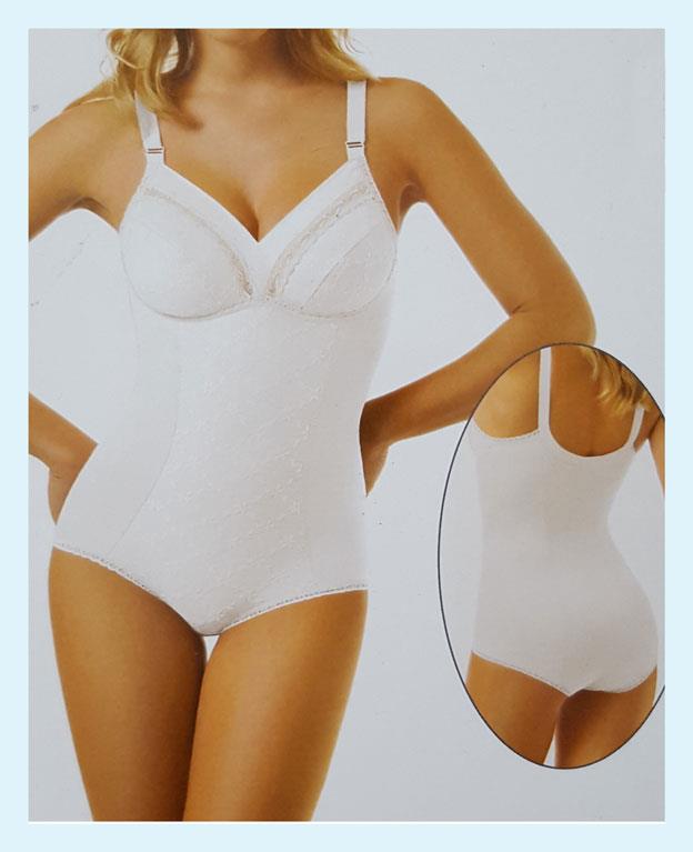 Descrizione Raffinato Body contenitivo senza ferretto con coppe con ripresa centrale e tessuto doppiato internamente in cotone, spalline regolabili.