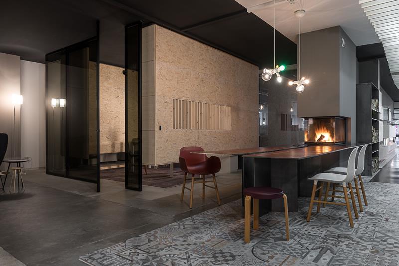 Costeggiando quest’area chiusa, la parete divisoria culmina, con un effetto a sorpresa, in una lunga scrivania con camino ad altezza tavolo. Una zona destinata alla prima accoglienza, ospitale e informale grazie al calore del fuoco e alla scenografia, al centro, della doppia cucina a isola.